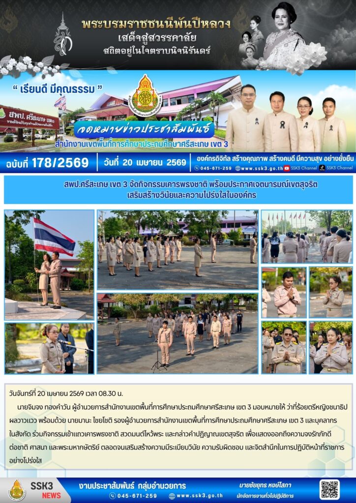 20 เม.ย.69 สพป.ศรีสะเกษ เขต 3 จัดกิจกรรมเคารพธงชาติ พร้อมประกาศเจตนารมณ์เขตสุจริต