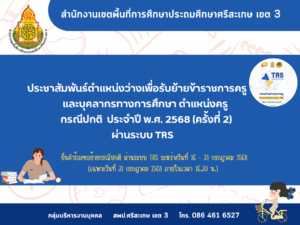 ประชาสัมพันธ์ตำแหน่งว่างเพื่อรับย้ายข้าราชการครูและบุคลากรทางการศึกษา ตำแหน่งครู กรณีปกติ ประจำปี พ.ศ. 2568 (ครั้งที่ 2) ผ่านระบบ TRS